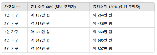 ✔ 일반 구직자는 가구 중위소득 60% 이하여야 하지만, 청년(만 15~34세)은 중위소득 120% 이하까지 가능하므로 소득 기준이 완화됩니다.